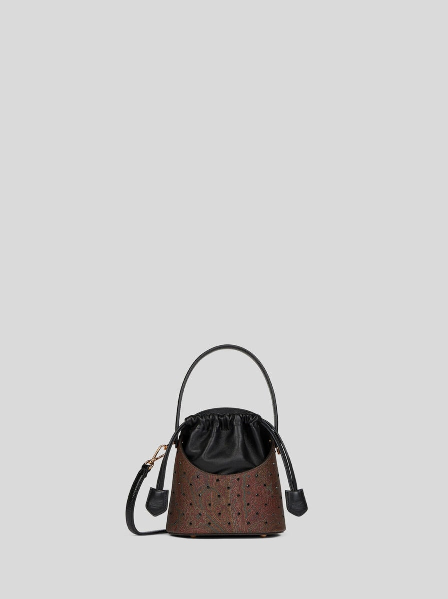 Small Saturno bucket bag in leather and iconic Paisley jacquard fabric dotted with crystal rhinestones. This bag stands out thanks to its oval handle and sack-like inner body with drawstring. The Saturno bag is perfect to carry by the handle or shoulder strap. • Dimensions (Width, Height, Depth): 7.3 x 4.7 x 7.1 inches (18,5 x 12 x 18 cm) • Drawstring closure • Short handle • Adjustable and detachable shoulder strap • Metal feet • Rhinestones • Made in Italy PRODUCT DETAILS • Exterior: Paisley jacquard cotton fabric coated with matt texture and lined with canvas • Coating: 100% PVC • Trims and details: 100% leather • Appliques: 100% crystal • Lining: 100% polyester