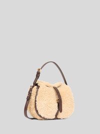 Soft-structured small Pony bag in shearling with leather details. This item features two closures: the main one with a magnetic button embellished with ETRO logo and Pegaso symbol, engraved using the same technique used to mint coins; and a second with a functional metal buckle. This model, presented at the Autumn-Winter 25 Runway Show, includes a fixed handle and detachable shoulder strap. • Dimensions (Width, Height, Depth): 8.9 x 6.3 x 2.8 inches (22.5 x 16 x 7 cm) • Magnetic and buckle closures • Fixed handle and detachable shoulder strap • Silver-finish metal accessories • Made in Italy PRODUCT DETAILS • Exterior: shearling • Details: calfskin • Lining: cowhide