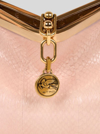 Iconic small Vela bag in fine Elaphe snakeskin whose glossy finish creates a natural ripple effect on the surface, epitomising the uniqueness of the accessory. This model can be carried by hand or on the shoulder thanks to the detachable and interchangeable strap and handle. This piece stands out for its distinctive metal closure and the medallion bearing the ETRO logo and Pegaso symbol engraved using the same technique used to mint coins. The accessory was presented at the Spring-Summer 25 Women's Runway Show. • Dimensions (Width, Height, Depth): 8.3 x 6.3 x 3.5 inches (21 x 16 x 9 cm) • Removable handle and shoulder strap • Metal feet • Light golden-finish metal details • Made in Italy PRODUCT DETAILS • 100% colubrid snakeskin (elaphe radiata) • Lining: 100% calfskin