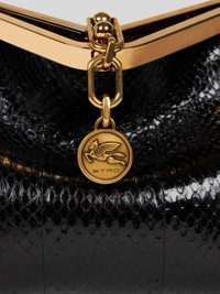 Iconic small Vela bag in fine Elaphe snakeskin whose glossy finish creates a natural ripple effect on the surface, epitomising the uniqueness of the accessory. This model can be carried by hand or on the shoulder thanks to the detachable and interchangeable strap and handle. This piece stands out for its distinctive metal closure and the medallion bearing the ETRO logo and Pegaso symbol engraved using the same technique used to mint coins. The accessory was presented at the Spring-Summer 25 Women's Runway Show. • Dimensions (Width, Height, Depth): 8.3 x 6.3 x 3.5 inches (21 x 16 x 9 cm) • Removable handle and shoulder strap • Metal feet • Light golden-finish metal details • Made in Italy PRODUCT DETAILS • 100% colubrid snakeskin (elaphe radiata) • Lining: 100% calfskin