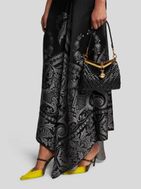 Iconic small Vela bag in woven leather. This model can be carried by hand or on the shoulder thanks to the detachable and interchangeable strap and handle. This model stands out for its distinctive metal closure and the medallion bearing the ETRO logo and Pegaso symbol engraved using the same technique used to mint coins. Complete with a convenient, zip-fastened suede clutch inside. • Size: 16 x 21 x 9 cm • Detachable shoulder strap • Metal feet • Removable mini pouch • Light golden-finish metal accessories • Made in Italy PRODUCT DETAILS • 100% leather