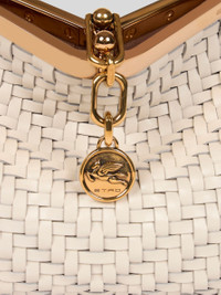 Iconic small Vela bag in woven leather. This model can be carried by hand or on the shoulder thanks to the detachable and interchangeable strap and handle. This piece stands out for its distinctive metal closure and the medallion bearing the ETRO logo and Pegaso symbol engraved using the same technique used to mint coins. • Dimensions (Width, Height, Depth): 8.3 x 6.3 x 3.5 inches (21 x 16 x 9 cm) • Detachable shoulder strap • Metal feet • Golden-finish metal details • Made in Italy PRODUCT DETAILS • Exterior: calfskin • Lining: cowhide
