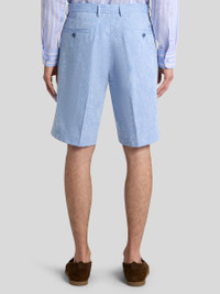 Shorts in striped pure cotton seersucker fabric with distinctive floral jacquard motif featuring Paisleys. This model is complete with a small embroidered Pegaso logo on the back on one of the two button-through welt pockets. • Regular fit • Welt side pockets • Rear button-through welt pockets • Concealed zip and button closure • Made in Italy • The model is 6' 1" (186 cm) tall and wears a size 48 PRODUCT DETAILS • 100% cotton