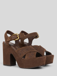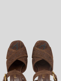 Platform sandals in soft suede with criss-crossing front bands, an ankle strap with branded buckle and an ETRO logo on the insole. This model is embellished with floral embroidery on the upper. • Total height: 3.9 inches (10 cm) • Platform height: 2 inches (5 cm) • Ankle-strap closure • Logo-branded insole • Made in Italy PRODUCT DETAILS • Upper: 100% cowhide • Details: 76% cotton, 24% polyester • Buckle: 100% brass • Lining: 100% goatskin • Sole: 100% cowhide