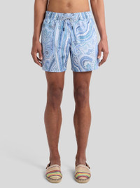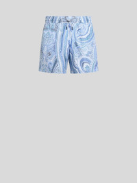Technical canvas swim shorts with decorative placed floral print with Paisley detailing. This model is complete with a small label featuring the Pegaso logo at the back. • Roma regular fit • Elasticated waist with drawstring • Made in Italy • The model is 6' 1½" (187 cm) tall and wears a size M PRODUCT DETAILS • 100% polyester • Lining: 100% polyester