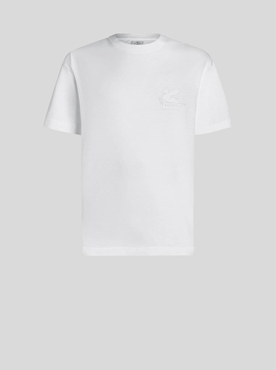 Plain-coloured pure cotton crew-neck T-shirt. The tonal embroidered ETRO monogram and iconic Pegaso symbol stand out on the chest. • Regular fit • Made in Italy • The model is 6' 1½" (187 cm) tall and wears a size M PRODUCT DETAILS • 100% cotton