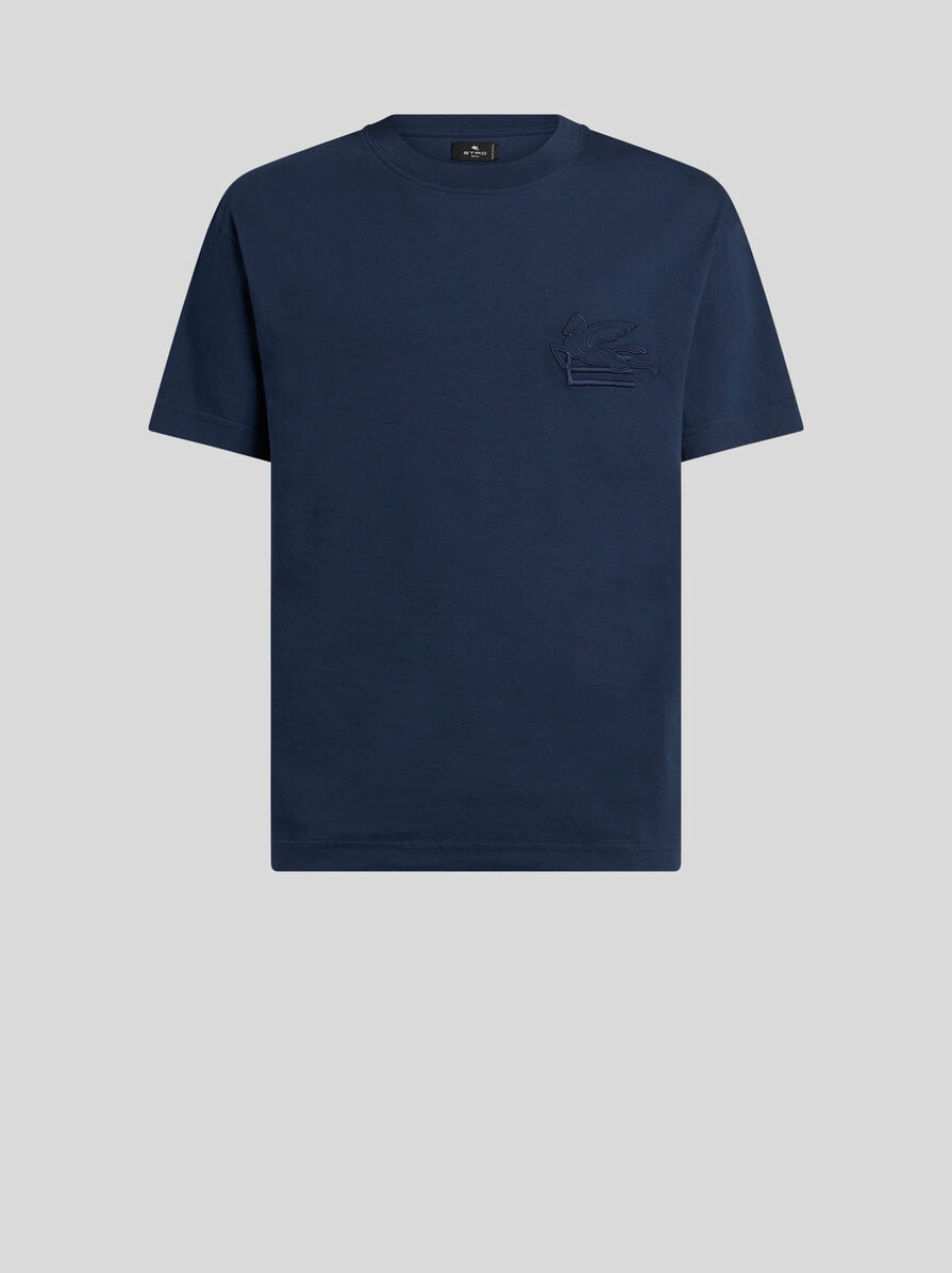 Plain-coloured pure cotton crew-neck T-shirt. The tonal embroidered ETRO monogram and iconic Pegaso symbol stand out on the chest. • Regular fit • Made in Italy • The model is 6' 1½" (187 cm) tall and wears a size M PRODUCT DETAILS • 100% cotton