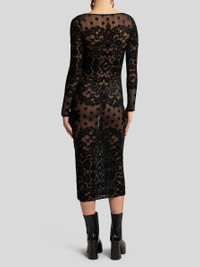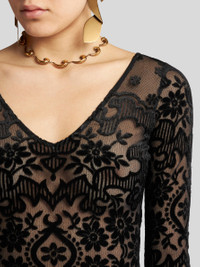 Midi-length sheath dress in devore velvet with floral motif. The double-layered tulle fabric with see-through effect makes it stand out. • Slim fit • V-neck • Long sleeves • Made in Italy • The model is 5’10” (178 cm) tall and wears a size 40 (IT) PRODUCT DETAILS • 81% viscose, 19% polyamide • Lining: 86% polyamide, 14% elastane
