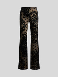 Slim-fit trousers, snug fit at the sides and flared bottom. This model is made from stretch tulle with a jacquard velvet motif. The double-layered tulle fabric with see-through effect makes it stand out. • Slim fit • High waist • The garment is unlined • Made in Italy • The model is 5’10” (178 cm) tall and wears a size 40 (IT) PRODUCT DETAILS • 81% viscose, 19% polyamide • Lining: 86% polyamide, 14% elastane