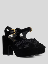 Platform sandals in soft velvet with criss-crossing front bands, an ankle strap with branded buckle and an ETRO logo on the insole. This model is embellished with floral embroidery on the upper. • Total height: 3.9 inches (10 cm) • Platform height: 2 inches (5 cm) • Ankle-strap closure • Logo-branded insole • Made in Italy PRODUCT DETAILS • Upper: 100% cotton • Buckle: 100% brass • Lining: 100% goatskin • Sole: 100% cowhide
