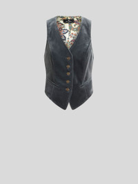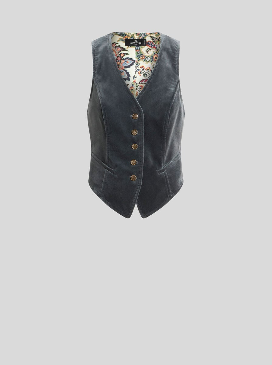 Cotton velvet waistcoat with buttons with raised Pegaso logo. This model features inner lining with a decorative, multicoloured floral Paisley print. • Regular fit • V-neck • Welt side slip pockets • Single-breasted closure • Made in Italy • The model is 5’10” (178 cm) tall and wears a size 40 (IT) PRODUCT DETAILS • 99% cotton, 1% elastane • Lining: 97% viscose, 3% elastane