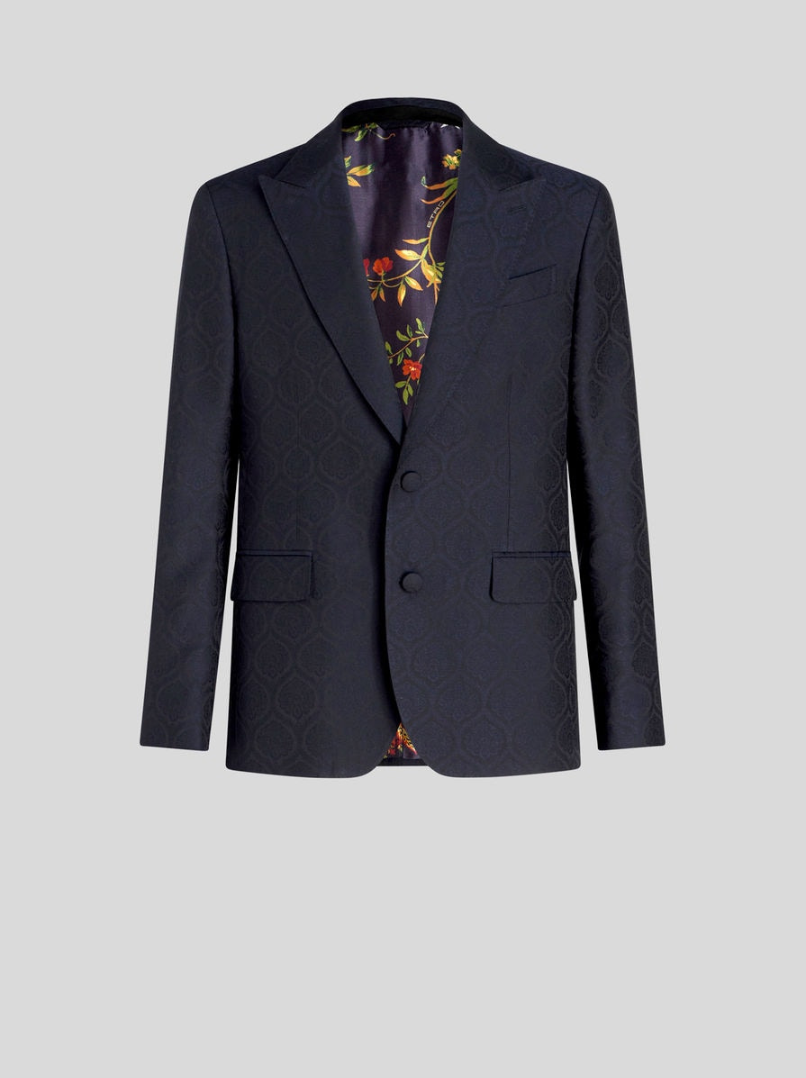 Evening jacket in wool and cotton jacquard with medallion motif. This model has structured shoulders, covered-button fastening and inner lining with a placed floral print. • Regular fit • Single-breasted closure • Welt breast pocket • Side slip pockets with flap • Rear vent • The model is (74.01" 188 cm) tall and wears a size 48 (IT) • Made in Italy PRODUCT DETAILS • 53% cotton, 47% wool • Interior: 100% viscose