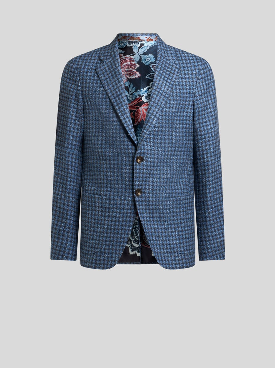 Single-breasted jacket in wool-blend fabric with houndstooth motif. This item features lining with a contrasting print. • Roma regular fit • Single-breasted two-button closure • Patch pockets on the front • Made in Italy • The model is 6' 1½" (187 cm) tall and wears a size 48 PRODUCT DETAILS • 59% wool, 33% cotton, 8% linen • Bodice lining: 100% viscose • Sleeve lining: 52% viscose, 48% acetate