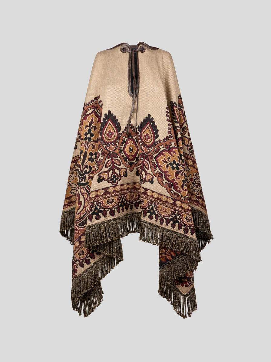 Wool-blend jacquard cape with Paisley motif featuring floral-inspired elements on the bottom part. This piece is complete with faux leather lacing at the neck and fringing at the ends. • Easy fit • Lacing at the neck • Made in Italy PRODUCT DETAILS • Main fabric: 46% wool, 46% acrylic, 8% cotton • Fringe details: 100% acrylic