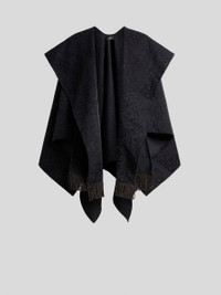 Layered cape in soft wool-blend velour, featuring a scarf-effect insert at the front and finished with small fringes at the ends. This piece has a hanky hem and is embellished with a delicate tone-on-tone jacquard motif depicting the iconic Paisley alongside foliage-inspired elements. • Easy fit • Made in Italy PRODUCT DETAILS • Main material: 55% wool, 34% polyester, 9% polyamide, 2% other fibres • Fringe details: 100% acrylic
