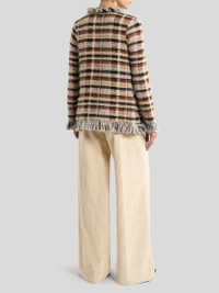 Closureless jacket in wool- and alpaca wool-blend jacquard fabric with grid motif. This model features decorative fringing along the edges and is complete with shiny lurex details. • Regular fit • Long sleeves • Side slip pockets • Closureless model • Made in Italy • The model is 5' 9½" (176 cm) tall and wears a size 40 PRODUCT DETAILS • 41% acrylic, 38% wool, 16% alpaca wool, 3% polyamide, 1% polyester, 1% metallised fibre