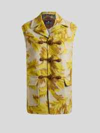 Duffle-style waistcoat in carded wool-blend cloth with striking worn effect. This item stands out for its leafy jacquard motif and features toggle, knotted-trim and Paisley-shaped-button fastening. The item was presented at the Autumn-Winter 25 Runway Show. • Regular fit • Toggle closure • Front pockets with flap • Rear yoke • Made in Italy • The model is 5' 9½" (176 cm) tall and wears a size 40 PRODUCT DETAILS • 80% wool, 20% polyamide • Lining: 52% viscose, 48% acetate