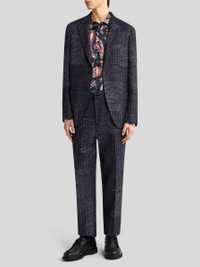 Tailored trousers in knit wool-blend fabric with tone-on-tone patchwork effect. These feature the classic pressed creases. • Regular fit • High waist • Side slip pockets • Buttoned patch pockets on back • Concealed zip and button closure • Made in Italy • The model is 6' 1½" (187 cm) tall and wears a size 48 (IT) PRODUCT DETAILS • 50% wool, 50% acrylic