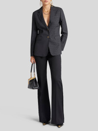 Single-breasted wool jacquard jacket with geometric, tone-on-tone tie-style motif. This model is enhanced by metal buttons with a raised Pegaso logo. The inner lining features a striped pattern. • Regular fit • Classic lapels • Single-breasted closure with Pegaso buttons • Welt breast pocket • Side slip pockets with flap • Cuffs with Pegaso buttons • Rear vents • Made in Italy • The model is 5’10” (178 cm) tall and wears a size 40 (IT) PRODUCT DETAILS • 100% wool • Lining: 52% viscose, 48% acetate