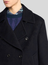 Double-breasted pure wool pea coat with tonal floral jacquard motif. This item features lining with a decorative contrasting print. • Regular fit • Double-breasted closure with buttons • Side slip pockets • Made in Serbia • The model is 6' 1½" (187 cm) tall and wears a size M PRODUCT DETAILS • 100% wool • Lining: 100% viscose