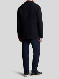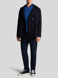 Peacoat in textured knit wool fabric with inner lining embellished with a multicoloured floral Paisley print. • Regular fit • Double-breasted closure with buttons • Lapel collar • Side slip pockets • Horn buttons • Rear vent • Made in Serbia • The model is 6’1”(186 cm) tall and wears a size M PRODUCT DETAILS • Exterior: 100% wool • Lining: 100% viscose