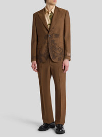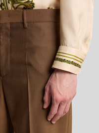Tailored trousers in plain-coloured pure wool fabric with pressed creases. • Regular fit • Side slip pockets • Rear welt pockets • Concealed zip and button closure • Bottom opening: 8.3 inches (21 cm) • Made in Italy • The model is 6' 1" (186 cm) tall and wears a size 48 PRODUCT DETAILS • 100% wool • Lining: 60% acetate, 40% viscose