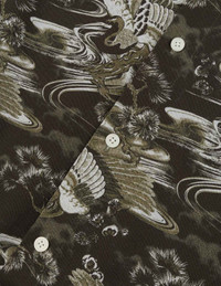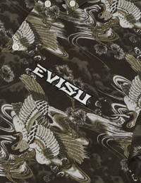 2EAHTM5SL1108RXCT This relax fit shirt features a distinctive allover crane print, showcasing unique artistic charm. The designer has deeply integrated the Japanese legend the "Grateful Crane" with traditional patterns, where the crane weaves fabric with its own feathers to thank the farmer who saved it, conveying a beautiful message of gratitude and reciprocation. The shirt reflects rich cultural significance and exquisite craftsmanship, perfectly blending traditional and modern design. - Relax fit - 100% Cotton - Allover Crane print - Logo embroidery - Button fastening - EVISU Premium Quality Kamon tag