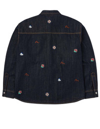 2EAHTM5SJ1044XXDN This denim shirt jacket showcases EVISU's exquisite craftsmanship with its unique playful theme and rich embroidery elements. The jacket is adorned with a variety of embroidered patterns, including the Godhead, Seagull, and Kamon, reflecting the brand's classic features and cultural significance while enhancing visual appeal and creativity - Regular fit - 100% Cotton - Allover brand embroidery - Button fastening, 3 pockets