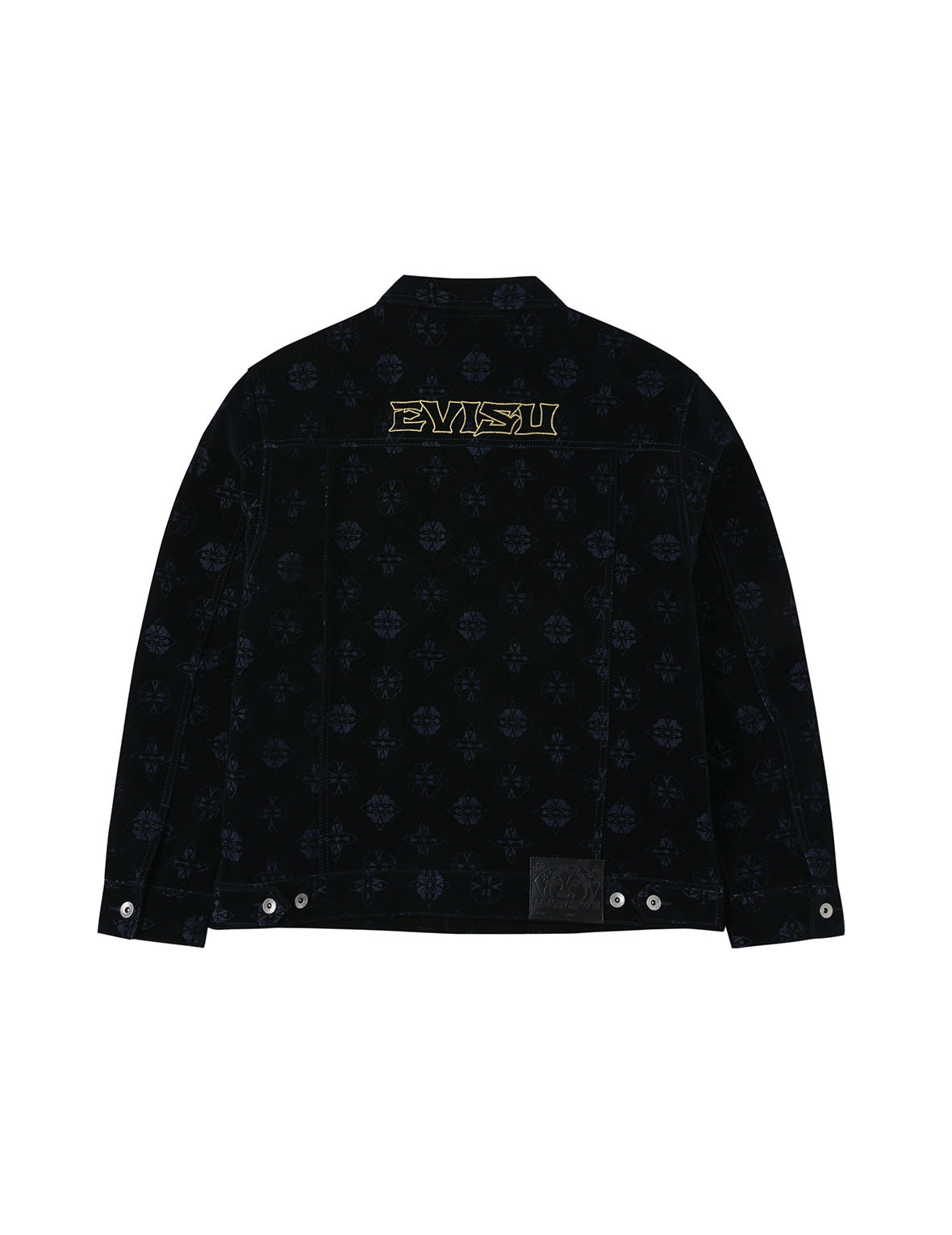 2EAHTM5DJ1015RXDN Unleash your unique personality with this denim jacket! Crafted with a relax fit, it features an allover Kamon flocking print that exudes a subtle yet bold fashion statement. The front pocket is adorned with intricate seagull embroidery, while the back showcases the brand's attitude through a signature embroidered logo, embodying understated luxury. - Relax fit - 100% Cotton - Allover Kamon flocking print - Seagull and Logo embroidery - Button fastening, 3 pockets - EVISU Japanese Kamon tag - Black Godhead leather patch