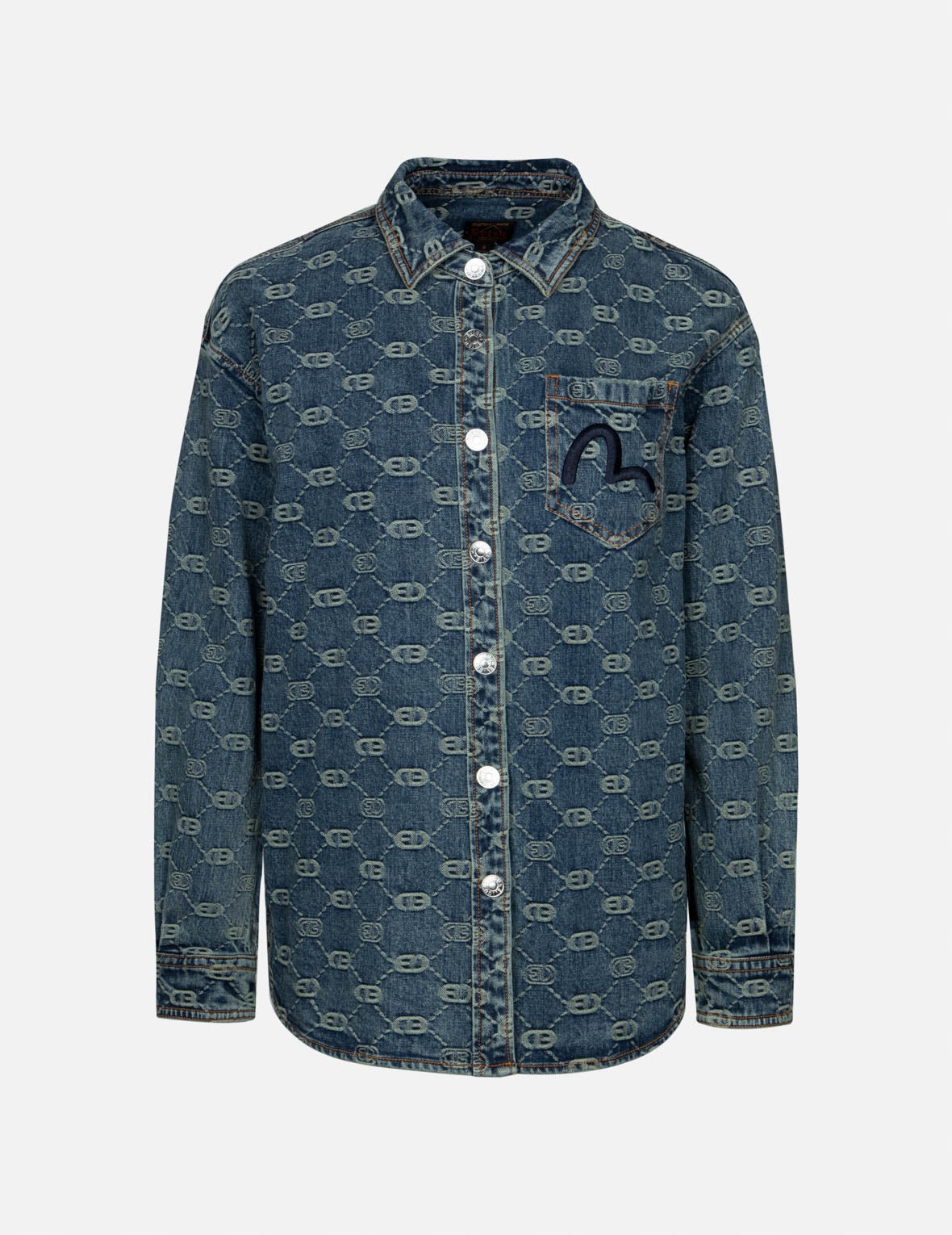 2EAHTW4SJ4026BFDN Offering a boyfriend-inspired silhouette, this denim shirt jacket can be worn as either a shirt or a jacket. The fabric features the brand's signature woven-in logo pattern, lending the design a distinctive touch. One of the standout details is the 3D embroidered seagull adorning the large front pocket, adding a visually arresting element. - Boyfriend fit - 99% Cotton, 1% Spandex - Allover logo jacquard and seagull embroidery - Button fly, 1 pocket - Godhead leather patch