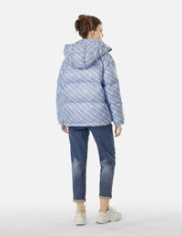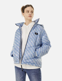 2EAHTW4NJ4048FFSN A Stylish Fusion of Streetwear and Function - This down jacket showcases a blend of trendy and practical appeal. Crafted in a denim-inspired fabric, it features the brand's iconic logo and Kamon graphics, exuding a vintage streetwear vibe. The plush down lining provides exceptional warmth, while the detachable hood lends versatility to the styling. Equally suitable as a standalone piece or as an outer layer for cold weather, this jacket elevates any outfit with its multifaceted appeal. - Fashion fit - 100% Polyester - Allover slogan and kamon print - Detachable hood - Zip fastening, 2 pockets