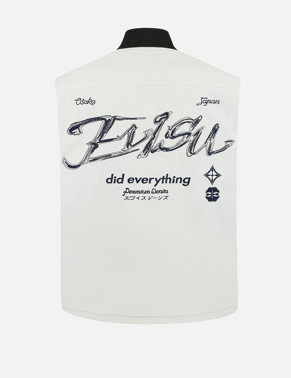 2ESHTM5VS1164FFCP Combining light workwear and Japanese-inspired details, this vest jacket is a standout piece in modern fashion. The intricate embroidery reimagines traditional Japanese aesthetics, featuring a seagull design on the front and the EVISU logo and slogan on the back, creating a harmonious artistic appeal. With two functional pockets, it elevates both practicality and the luxurious appeal of workwear. - Fashion fit - 62% Cotton, 38% Polyester - Artistic logo, Seagull and slogan embroidery - Zip fastening, 2 pockets - EVISU Premium Quality Kamon tag