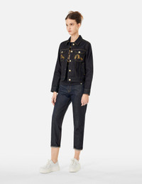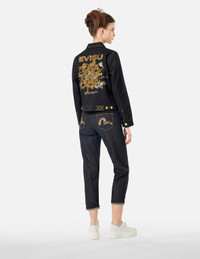 2EAHTW4DJ4004XXDN This premium denim jacket showcases the brand's classic design elevated with high-quality cotton denim. Luxurious details like golden topstitching, buttons, and black-gold leather patche lend a refined, fashionable look. Elegant embroidered seagull and rose jacquard framed in golden threads balance opulence and soft femininity, creating a versatile piece to express your personal style. FIT & STYLING: REGULAR CARE HAND WASH COLD INSIDE OUT MILD DETERGENT DO NOT BLEACH HANG DRY ONLY COOL IRON ON REVERSE SIDE IF NEEDED STEAM IRONING MAY CAUSE IRREVERSIBLE DAMAGE DO NOT DRY CLEAN DO NOT IRON ON PRINT