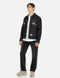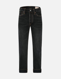 2EAHTM3JE119500DN EVISU’s black baggy-fit jeans enjoy a relaxed, wide-leg cut inspired by retro styles. They have undergone dark tone wash and finished with a faded ecru Daicock at the back. - Dark tone washed denim - 2000 Baggy fit - Daicock print - Button fly, 5 pockets - Godhead leather patch FIT & STYLING: 2000 BAGGY CARE HAND WASH COLD INSIDE OUT MILD DETERGENT DO NOT BLEACH HANG DRY ONLY COOL IRON ON REVERSE SIDE IF NEEDED STEAM IRONING MAY CAUSE IRREVERSIBLE DAMAGE DO NOT DRY CLEAN DO NOT IRON ON PRINT