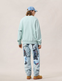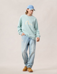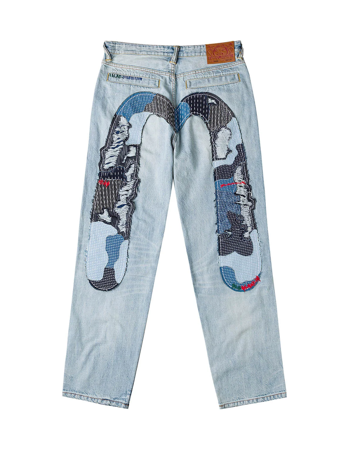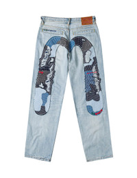2ESHTM6JE104838DN These light-wash jeans reinterpret EVISU’s Daicock with an intricate sashiko and patchwork treatment across the back, creating a hand-crafted, artful focal point. Subtle distressing and sashiko-reinforced pockets add vintage character while keeping the look effortlessly street-ready. - Loose fit #2038 - Light-wash denim with distressed details - Sashiko stitching and patchwork Daicock - Sashiko-reinforced pocket panels - Button fly, 5 pockets