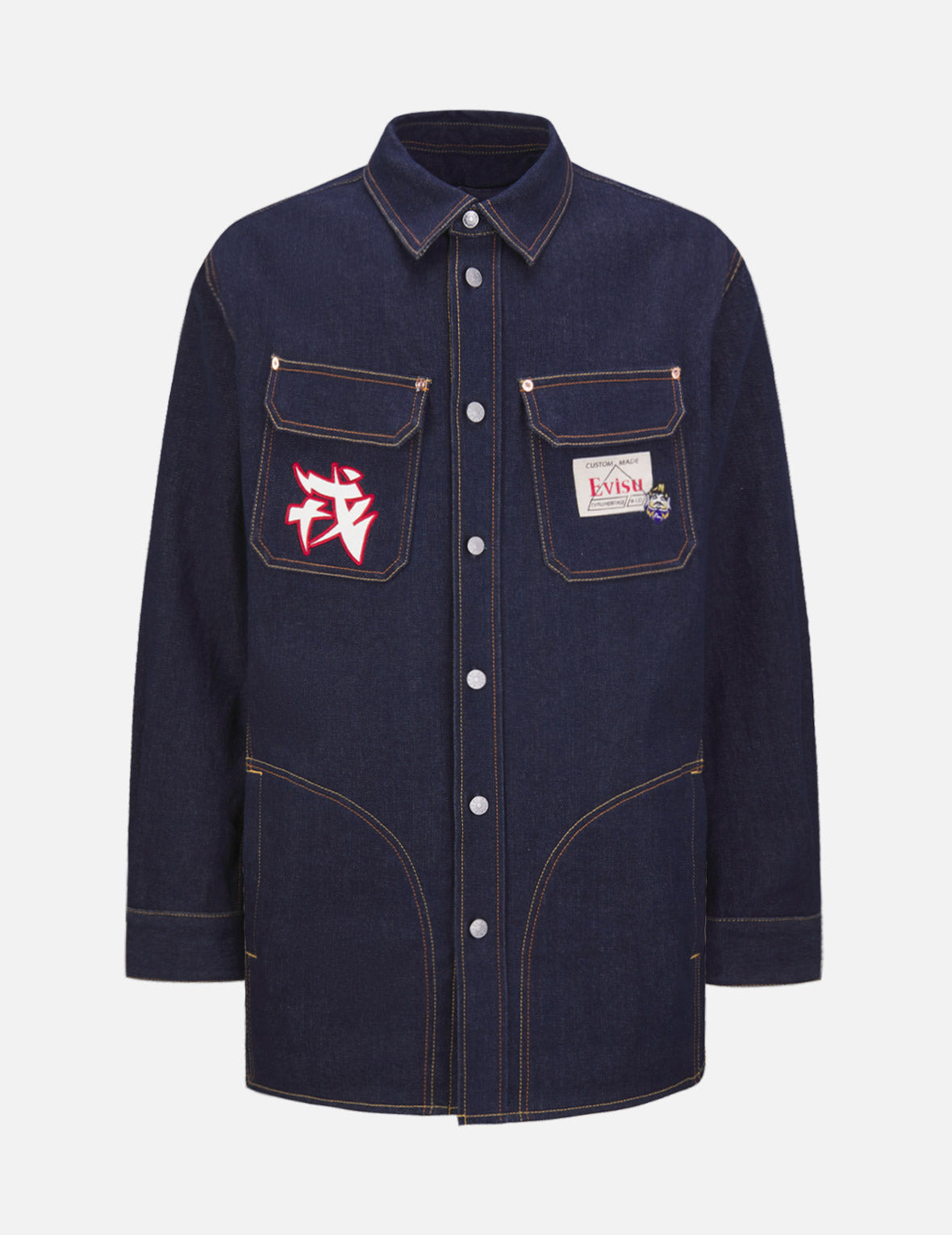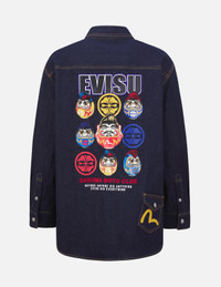 2EAHTM1SJ124LFDN Crafted with garment washed new zig-zig denim, this oversized denim shirt jacket is your statement winter staple: the chest pockets are adorned with Ebisu Kanji and Godhead Daruma embroidery, while the back panel features a collection of Kamon and Pompadour Daruma print with metallic tone embroidery highlight on the hairstyle. The mini pocket with seagull print on the back offers a fun-filled touch to the jacket. - 11.2oz garment washed denim - Oversized fit - Pompadour Daruma print and embroidery, Kamon, seagull and EVISU text print, Kanji embroidery - Long sleeves, 5 pockets, button fastening - Custom Made EVISU Heritage tag - 99.2% Cotton, 0.8% Spandex CARE MACHINE WASH COLD INSIDE OUT AND SEPARATELY DELICATE CYCLE DO NOT BLEACH HANG DRY ONLY DO NOT IRON DO NOT DRY CLEAN
