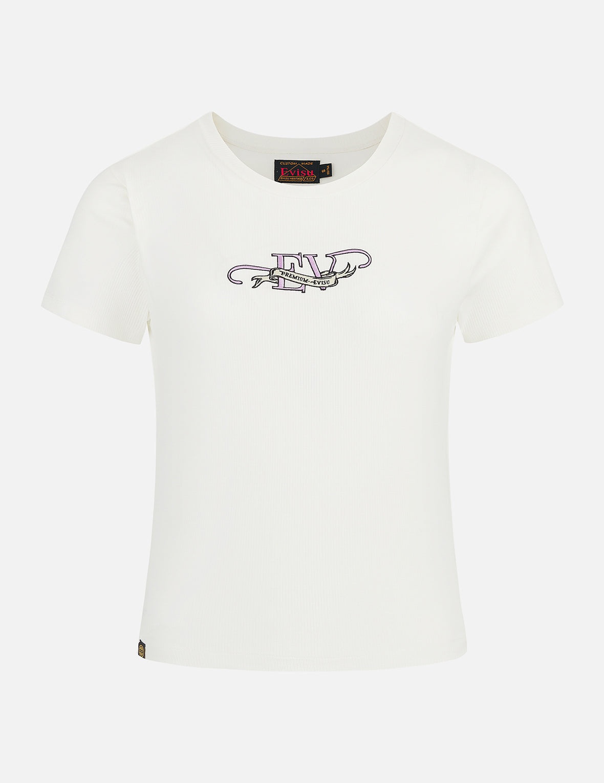 2ESHTW5TS4025SLCT This T-shirt is made from soft fabric and features an elegant cursive "EV" print on the front, showcasing a minimalist yet stylish appeal. - Slim fit - 46% Viscose, 40% Cotton,14% Elastane - Cursive logo "EV" print