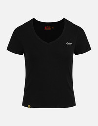 2ESHTW5TS4029FFCT This stylish V-neck T-shirt from EVISU features a minimalist design, accented only by Evisu metal trim, showcasing a subtle sense of luxury. It's versatile for various outfits, effortlessly highlighting your individuality and taste. - Fashion fit - 92% Cotton, 8% Elastane - Evisu Metal Trim
