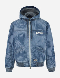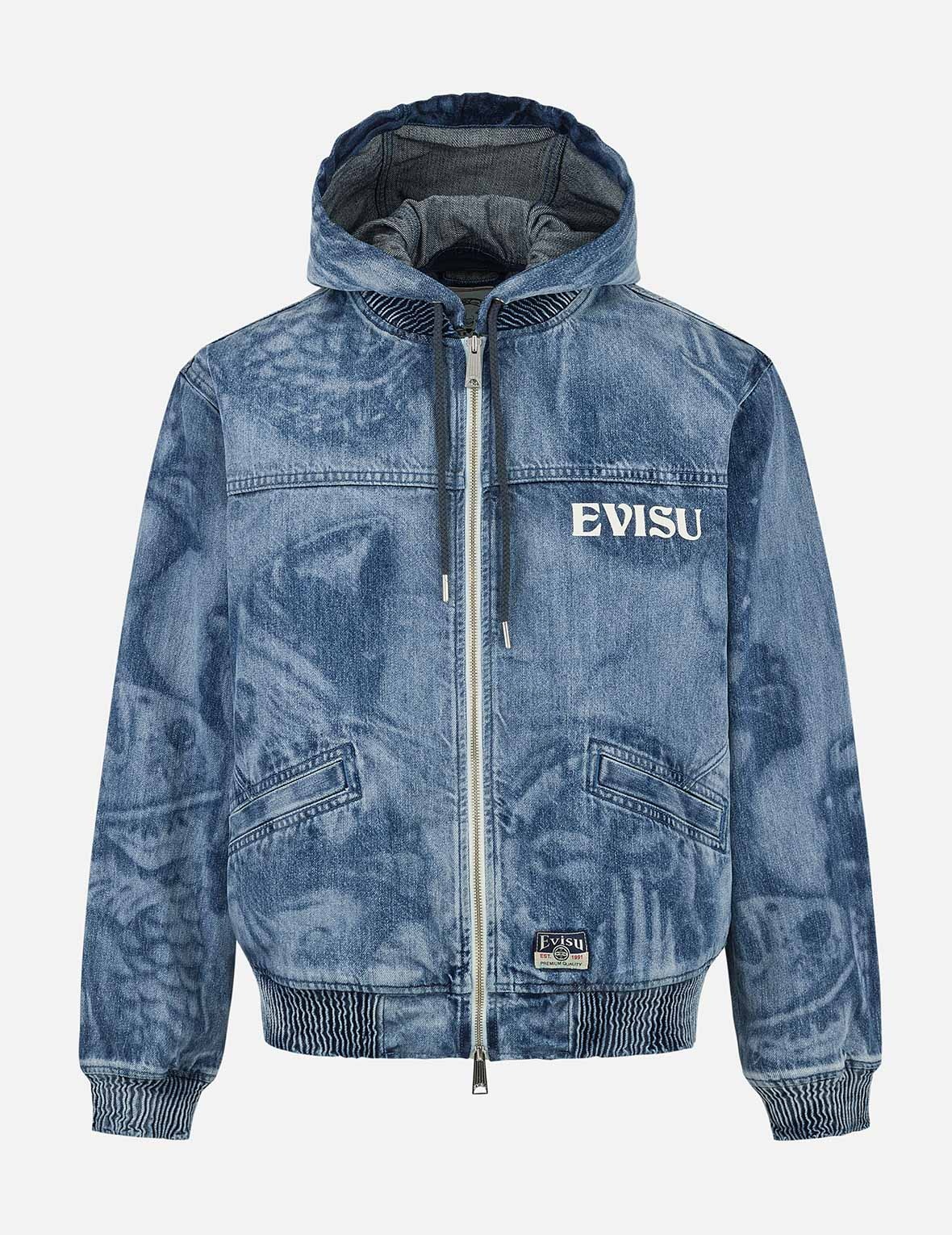 2ESHTM5DJ1034LFDN Crafted with precision and innovation, this denim jacket showcases a lifelike fisherman Godhead motif using laser technology. Its light wash and smoky back design create a layered, Japanese-inspired look, complete with EVISU’s signature logo. - Loose fit - 100% Cotton - Fisherman Godhead laser print - Drawstring hood, zip fastening, and 4 pockets - EVISU Premium Quality Kamon tag
