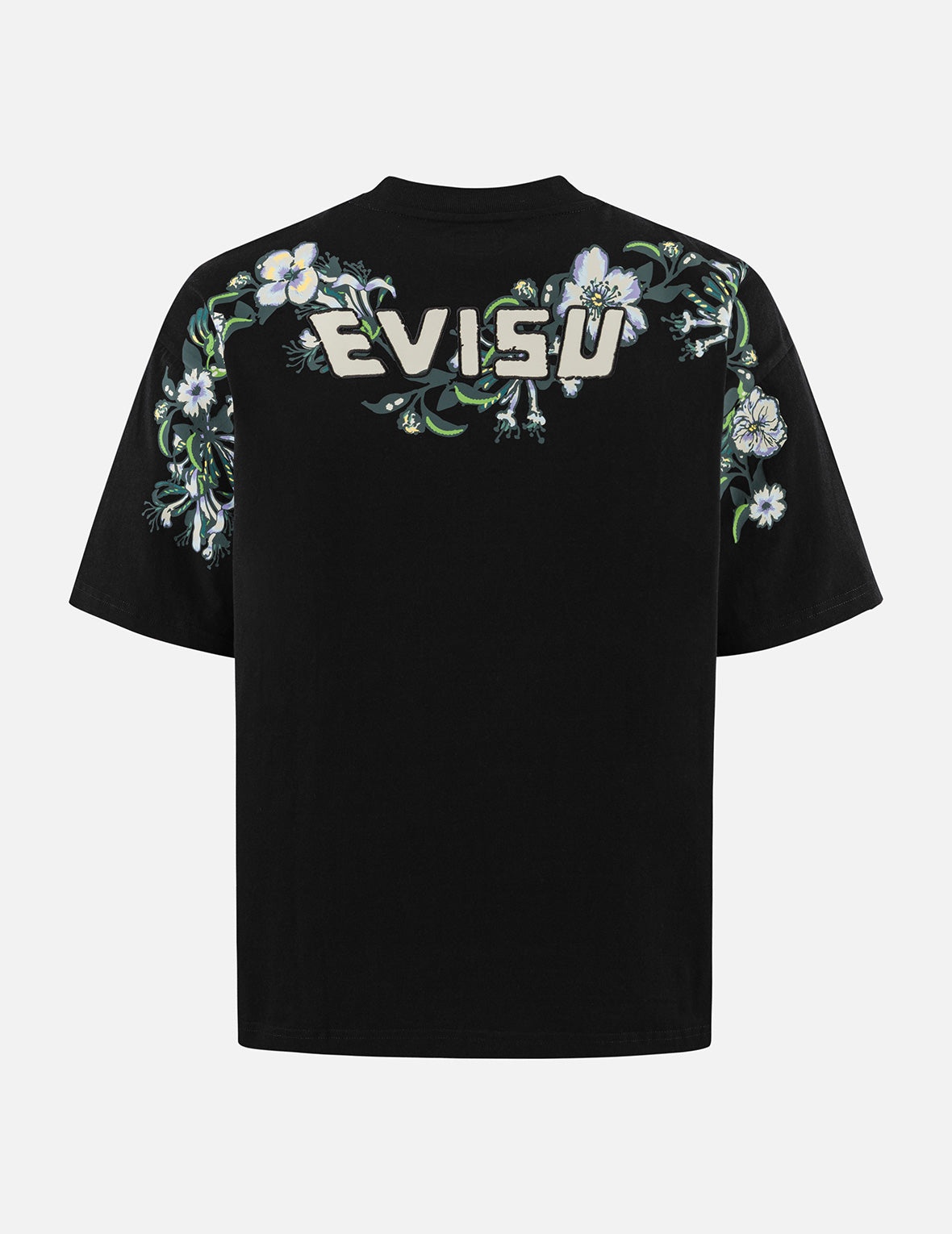 2ESHTM5TS1222LFCT This loose-fitting T-shirt shines in pristine white, its back a canvas where floral Daicock and EVISU’s iconic emblem fuse in exquisite embroidery, exuding rich artistic flair. The floral elements dance with masterful stitching, infusing the piece with bold fashion tension and a radiant individuality, effortlessly radiating a laid-back yet elegant charm. - Loose fit - 100% Cotton - Floral Daicock and logo embroidery - EVISU Premium Quality Kamon tag
