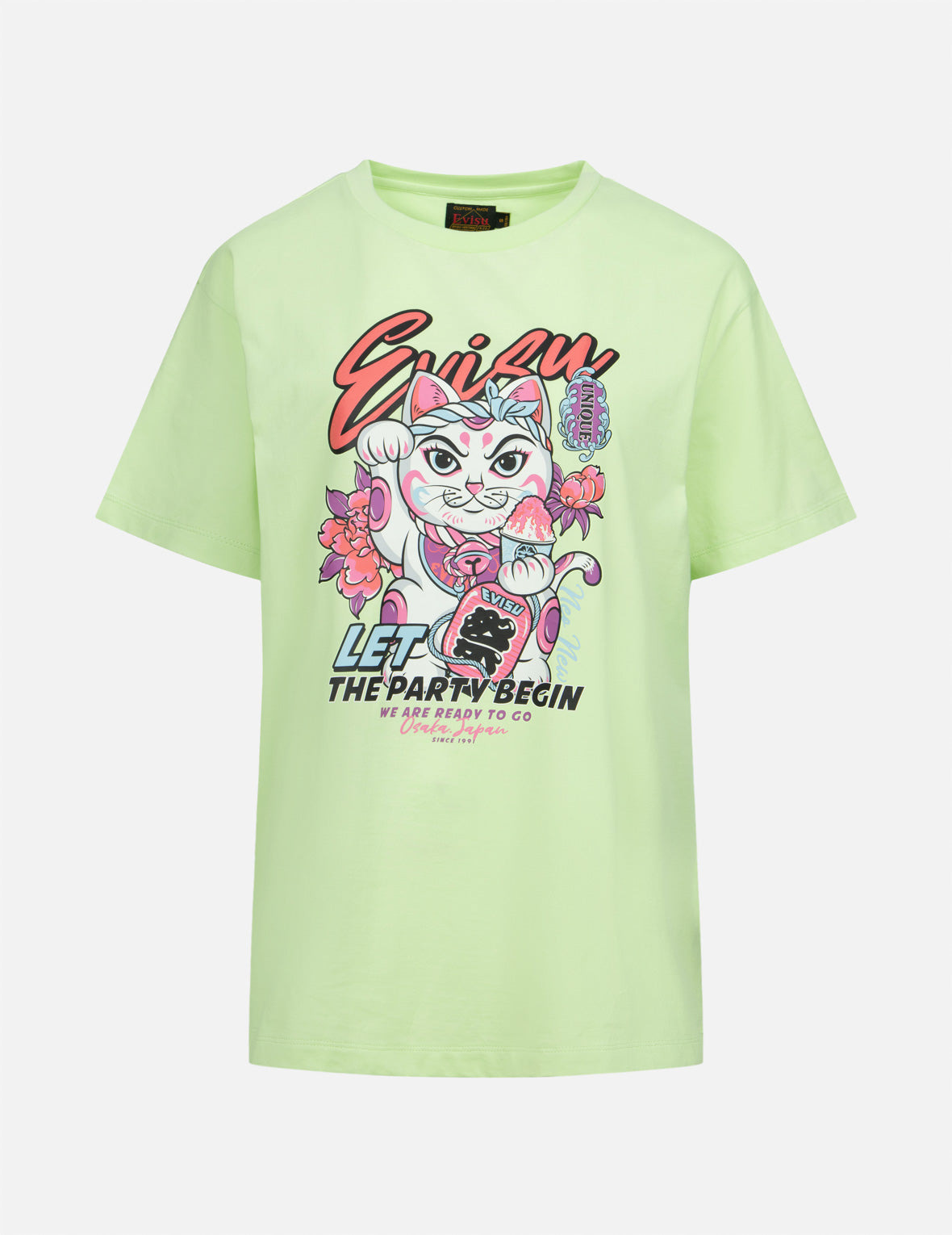 2ESHTW4TS4040BFCT This T-shirt is themed around a spring festival, featuring a design that combines a Fortune cat holding a shaved ice dessert with vibrant flowers, creating a delightful and festive atmosphere. FIT & STYLING: BOYFRIEND CARE MACHINE WASH COLD INSIDE OUT DELICATE CYCLE DO NOT BLEACH HANG DRY ONLY COOL IRON ON REVERSE SIDE IF NEEDED STEAM IRONING MAY CAUSE IRREVERSIBLE DAMAGE DO NOT DRY CLEAN DO NOT IRON ON PRINT