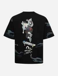 2EAHTM4TS1094LFCT This T-shirt brings you unique and eye-catching design elements. The entire T-shirt is filled with auspicious cloud patterns, with a Seagull design on the front. The back showcases a Godhead Ninja riding a skateboard, along with highlights such as the brand slogan. All these details are cleverly blended together, perfectly showcasing EVISU's distinctive design aesthetics. FIT & STYLING: LOOSE CARE MACHINE WASH COLD INSIDE OUT DELICATE CYCLE DO NOT BLEACH HANG DRY ONLY COOL IRON ON REVERSE SIDE IF NEEDED STEAM IRONING MAY CAUSE IRREVERSIBLE DAMAGE DO NOT DRY CLEAN DO NOT IRON ON PRINT