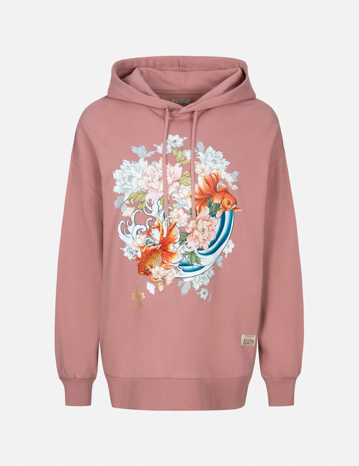 2EAHTW3SW4026OSCT EVISU’s hoodie is built for an oversize profile from smooth cotton Terry. It is decorated with a myriad of floral flow and goldfish graphic on the front, where a gradated embroidery of goldfish pops out for visual interest. The floral flow and goldfish are a symbol of good luck and prosperity in Japanese traditional culture. - Oversized fit - Goldfish and floral flow graphic print and embroidery, EVISU logo foil print - Drawstring hood, long sleeves, ribbed trims - Custom Made EVISU Heritage tag - 100% Cotton FIT & STYLING: OVERSIZE CARE HAND WASH COLD MILD DETERGENT DO NOT BLEACH HANG DRY ONLY COOL IRON ON REVERSE SIDE IF NEEDED STEAM IRONING MAY CAUSE IRREVERSIBLE DAMAGE DO NOT DRY CLEAN DO NOT IRON ON PRINT