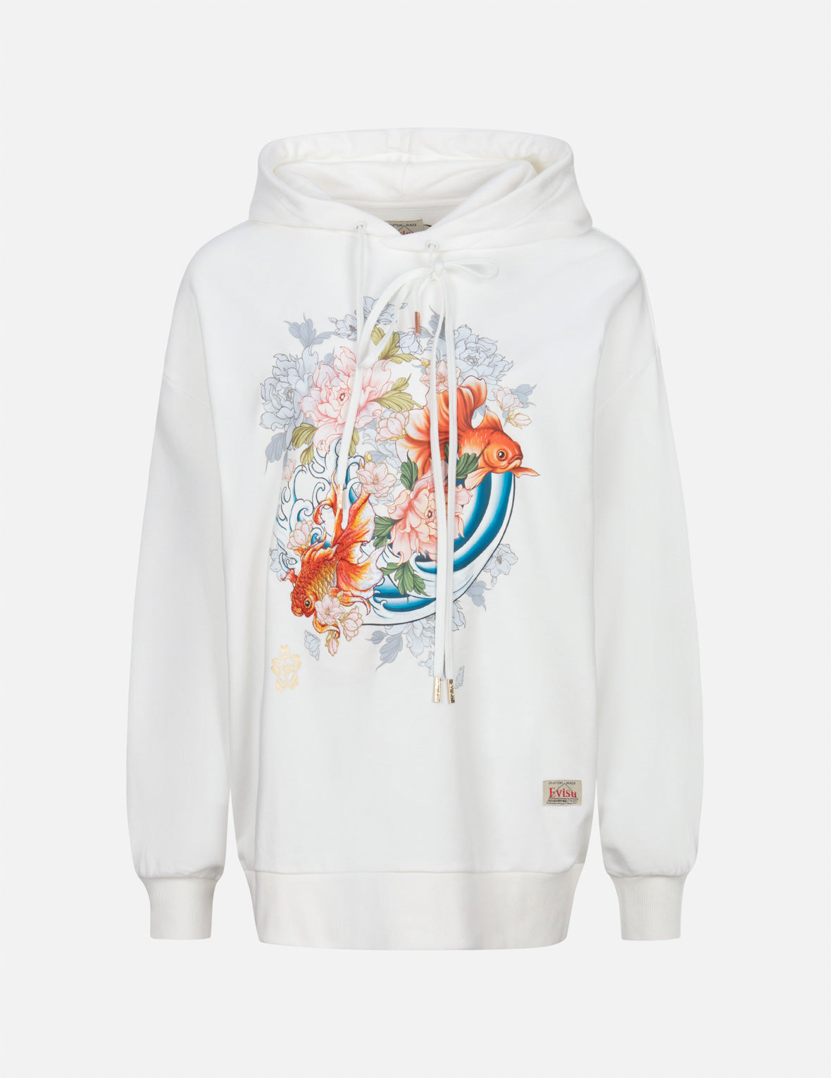 2EAHTW3SW4026OSCT EVISU’s hoodie is built for an oversize profile from smooth cotton Terry. It is decorated with a myriad of floral flow and goldfish graphic on the front, where a gradated embroidery of goldfish pops out for visual interest. The floral flow and goldfish are a symbol of good luck and prosperity in Japanese traditional culture. - Oversized fit - Goldfish and floral flow graphic print and embroidery, EVISU logo foil print - Drawstring hood, long sleeves, ribbed trims - Custom Made EVISU Heritage tag - 100% Cotton FIT & STYLING: OVERSIZE CARE HAND WASH COLD MILD DETERGENT DO NOT BLEACH HANG DRY ONLY COOL IRON ON REVERSE SIDE IF NEEDED STEAM IRONING MAY CAUSE IRREVERSIBLE DAMAGE DO NOT DRY CLEAN DO NOT IRON ON PRINT
