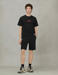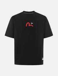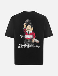 2ESHTM5TS1224XXCT This golf-themed T-shirt radiates athletic energy. The front showcases a unique print of a Seagull and the EVISU flag, while the back features a Godhead dressed in EVISU apparel, complemented by the brand's slogan. The design seamlessly blends athletic elements with fashion, highlighting the brand's distinctive allure and adding a touch of casual vitality to everyday wear. - Regular fit - 100% Cotton - Seagull, EVISU flag, Godhead and slogan prints