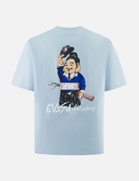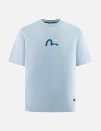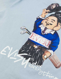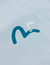 2ESHTM5TS1224XXCT This golf-themed T-shirt radiates athletic energy. The front showcases a unique print of a Seagull and the EVISU flag, while the back features a Godhead dressed in EVISU apparel, complemented by the brand's slogan. The design seamlessly blends athletic elements with fashion, highlighting the brand's distinctive allure and adding a touch of casual vitality to everyday wear. - Regular fit - 100% Cotton - Seagull, EVISU flag, Godhead and slogan prints