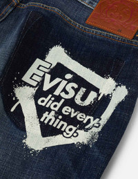 2ESHTM5JO1066STDN With graffiti-inspired seagull and slogan prints, these straight-leg denim joggers are infused with a distinctive street art aesthetic. The combination of the seagull print on the back and the "EVISU DID EVERYTHING" slogan enhances the design with individuality and innovation, making it easy to achieve a fashionable and bold outfit. - Straight fit - 99% Cotton, 1% Elastane - Graffiti-style Seagull and logo print - Button fly, 4 pockets - Godhead leather patch