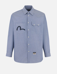 2ESHTM5SL1073RXCT Featuring a mix of half-Kamon embroidery and print designs, this oversized casual long-sleeve shirt offers a unique and stylish appeal. The chest pocket is embellished with an intricate seagull pattern, while the back displays a striking slogan, elevating its individuality and brand recognition. Designed for comfort, it’s ideal for various casual occasions, whether paired with jeans or casual pants, effortlessly creating a chic and modern look. - Relax fit - 100% Cotton - Half-Kamon embroidery and print - Seagull and slogan print - Button fastening, 2 pockets - EVISU Premium Quality Kamon tag