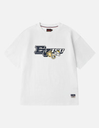 2EAHTM5TS1165RXCT This T-shirt is crafted with a pure white base, radiating a minimalist yet avant-garde street vibe! The front is effortlessly highlighted with a striking EVISU logo print, while the back features a bold Daicock print, combining Henohenomohe Godhead, logo, and Wheel of Wisdom tag print for a perfect fusion of art and attitude. - Relax fit - 100% Cotton - Henohenomohe Godhead, logo and Wheel of Wisdom tag Daicock print - EVISU logo print - EVISU Premium Quality Kamon tag
