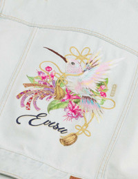 2ESHTW5DJ4002LFDN Featuring a hummingbird and magnolia theme, this denim jacket showcases exquisite embroidery that exudes an air of nobility, complemented by brand logo embroidery that adds a strong brand style. The front is adorned with a Seagull embroidery, bringing a touch of vibrancy and playfulness to the overall design. - Loose fit - 100% Cotton - Hummingbird, magnolia, logo, and Seagull embroidery - Button fastening, 4 pockets